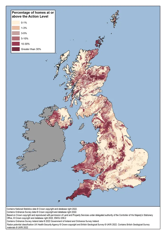 Each year, more than 1,100 lung cancer deaths in the UK are linked to radon. A colourless, odourless, radioactive gas, radon is formed by the radioactive decay of small amounts of uranium that occur naturally in all rocks and soils. Radon produces radioactive particles in the air we breathe, which become trapped in our airways and emit radiation that damages our lungs. This damage increases our risk of lung cancer, especially when linked with smoking. Radon is everywhere, both outside and indoors, in all parts of the UK. In most areas, the indoor radon levels are low and the risk to health is small. But in ‘Affected Areas’ it is higher and, if you are a social landlord or employer, it is your responsibility to protect your tenants or employees from radon exposure and potential harm.